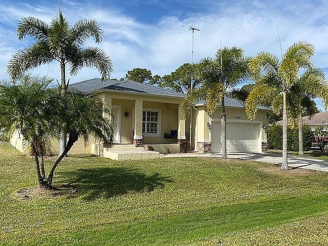 Tranquil Floridian Home with Tropical Vibes! Located in the friendly waterfront boating community of Gulf Cove, this welcoming 3BR/2BA, 1,460sqft abode entices with a vibrant, yet sheer yellow exterior, while the gorgeous palm trees create the feeling of a Caribbean oasis. Beautifully built in 2009 and utilized as a personal vacation residence for the last ten years, the home has been immaculately maintained and well-loved. Approaching the split-floorplan home, you immediately notice the covered front porch, neat landscaping, stone detailing, and the cozy porch swing. Enter the interior to find an open concept floorplan, durable tile flooring, vaulted ceilings, and glowing natural light. Envision hosting gatherings in the expansive living room and kitchen. Guests can chat and relax, as you mix drinks in the kitchen featuring stainless steel appliances, bright white cabinetry, recessed lighting, breakfast bar w/pendant lights, dishwasher, stylish countertops, pantry, and an adjoining dining area. Head outdoors to find a sizeable screened-in lanai, which is ideal for afternoon coffee with friends and family! During the warm summers, grill your fresh catch outdoors and enjoy the massive green space. Before drifting off to sleep in the large master bedroom, relish in the comforts of the attached en suite with a walk-in shower and dual sinks! Two additional bedrooms are generously sized and share a full bathroom. Other features: attached 2-car garage, partially furnished, city water, hurricane shutters, tons of storage, laundry room, less than 1-mile to the community boat ramp, 11-miles to Englewood Beach, close to shopping, restaurants, entertainment, and schools, and more!