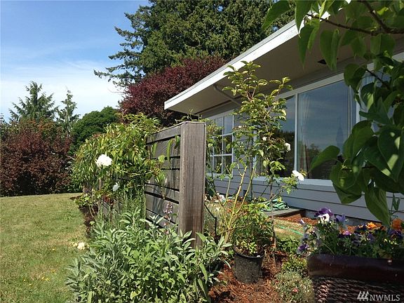 Edmonds Bowl: Light & bright, near original Mid Century Modern set high off street; incredible privacy w/ Sound & Mountain views just steps from everything Edmonds! Kitchen/nook & LR & DR span full western side w/ spectacular views. 3 bedrooms face spacious fenced backyard w/ fruit trees. 1 full bath & Hallway built-ins have New skylights. Kitchen boasts updated ss appliances. Newer top-of-the-line lg cap w/d in garage. New membrane roof (2020) transferrable material warranty. Updated electric.