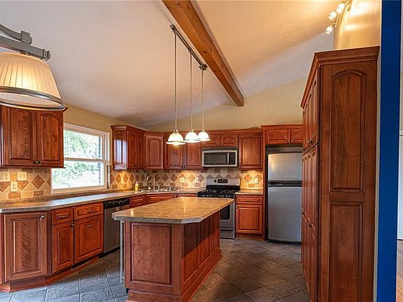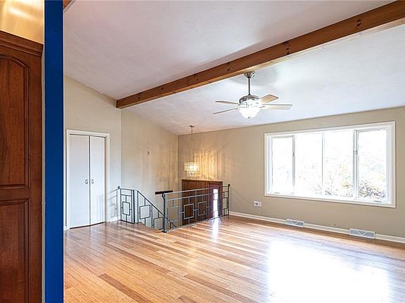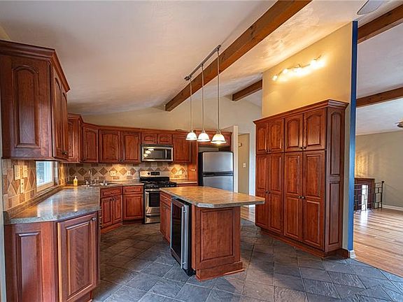 Move right in! This contemporary split features an updated kitchen with ALL appliances, center island with beverage refrigerator, dining room area with access to the rear deck and yard*Light and bright the open floor plan boasts polished hardwood flooring, exposed beam cathedral ceiling and French doors to the level rear yard*oversized one car garage with man door*minutes to Bellwood Park and Monroeville Mall*