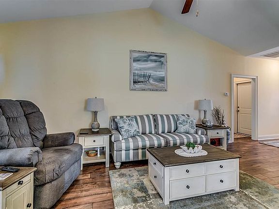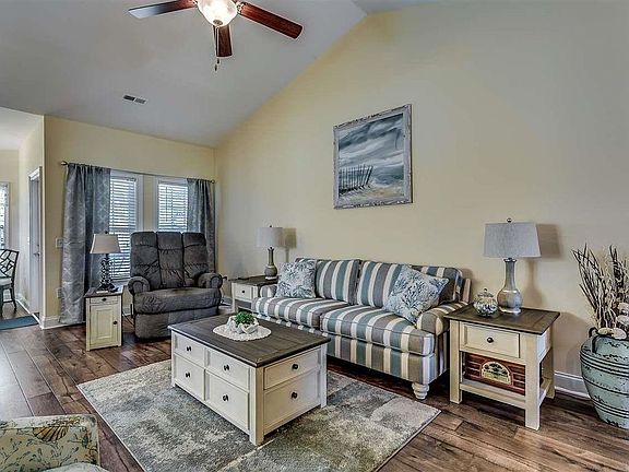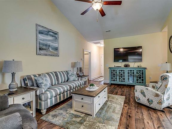 Just reduced! This 3 bedroom 2 bath home has so much to offer- beautiful hardwood throughout living areas, plush new carpet in bedrooms, vaulted ceilings, separate dining area, breakfast nook, yet an open floor plan for entertaining or watching the kids from the kitchen. Screened porch is very quiet with views of the lake and wooded area, and a back patio lends itself to an outdoor area for your grill and patio table. Large master bedroom with a huge walk-in shower as well as separate garden tub and walk-in closet makes this an oasis, with the other bedrooms separate and on the other side of the home. Two car garage, with a driveway big enough for 4 more cars is a plus. Sit on your front porch and visit with your friendly neighbors. Easy to get to the beach, shopping, restaurants, golf, and Hwy 22 if you are traveling out of town. Great price-make it yours!