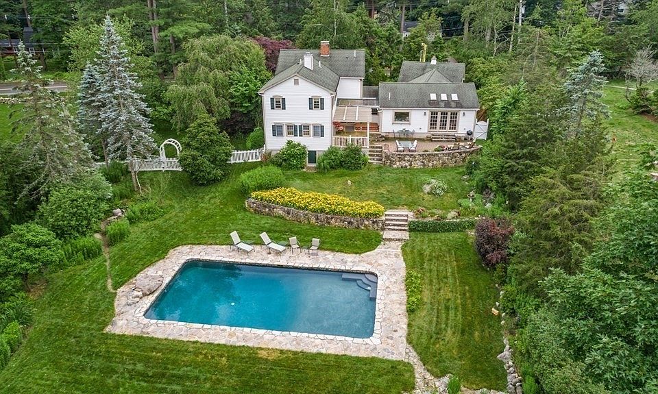 Do you work from home? Need a spacious first floor bedroom for in-law suite? This thoughtfully updated & expanded 4 BR home has BOTH! Loads of character interwoven with today's amenities. The open concept chef's kitchen & great room with gorgeous stone fireplace are the heart of the home. Spacious dining room for entertaining. Dedicated home office. The living room w/FP offers multi-use opportunities. First floor BR w/adjacent full bath being used as family room offers options as in-law, guestroom, etc. Upstairs features 3 bedrooms, including the primary suite with cathedral ceiling, beautifully designed ensuite bath & walk-in closet. Recently renovated sleek main hall bath. Outside is a luxurious oasis. Year-round hot tub on the deck and the completely redone inground pool (May 2023) will provide years of enjoyment. Expansive/beautifully landscaped lawn w/koi pond and waterfall. GO GREEN with BRAND NEW GEOTHERMAL system offering LOW COST heat & a/c during your ownership! VISIT NOW!