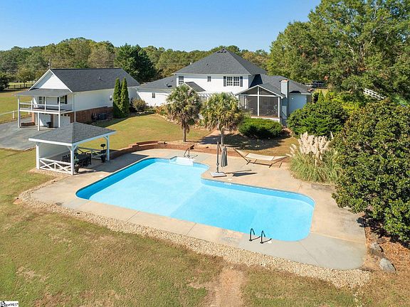Step into a world of elegance and tranquility with this beautifully remodeled home, expertly crafted by local builder J. Francis. Reimagined down to the studs, this residence seamlessly blends modern luxury with timeless charm. Located in the highly desirable area between Pelham/I-85 and Five Forks, this 4-bedroom, 2 full bath, and 2 half bath estate rests on a sprawling 5.13-acre property, offering privacy, space, and an array of premium amenities, including a garage apartment. The grand two-story foyer opens to an inviting great room, featuring a cozy gas fireplace, perfect for relaxation. Adjacent is the chef’s kitchen, boasting bright, updated finishes ideal for family gatherings and entertaining. The main-level primary suite ensures ultimate comfort and privacy, while a rec room, complete with a fireplace and built-in cabinets, serves as a versatile movie or playroom for kids of all ages. Step out to the screened porch, complete with a fireplace, offering views of a serene outdoor paradise that includes a sparkling pool with a covered sitting area and expansive grounds leading to a massive fire pit. Upstairs, three additional bedrooms each feature private balconies, providing personal retreats for family or guests. Outside, enjoy your very own oasis with a saltwater pool, perfect for hours of relaxation and fun. Gather around the custom firepit with family and friends, surrounded by the beauty of nature. The property’s extensive grounds include private bike and walking trails that wind through the woods, leading to a tranquil creek at the property’s edge. Additional features include a detached 4-car garage with an upper-level apartment, complete with a Murphy Bed, full bath, kitchenette, and private balcony—perfect for guests or a secluded home office. This property is more than a home; it’s a lifestyle. Schedule your showing today to experience this breathtaking estate firsthand.