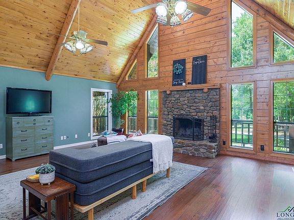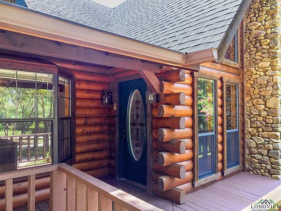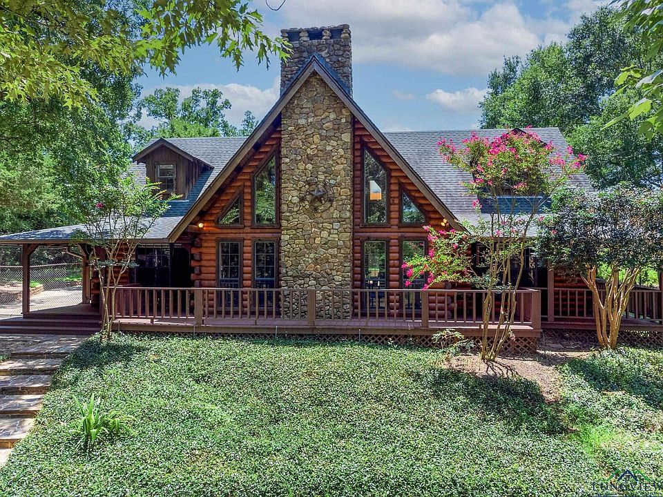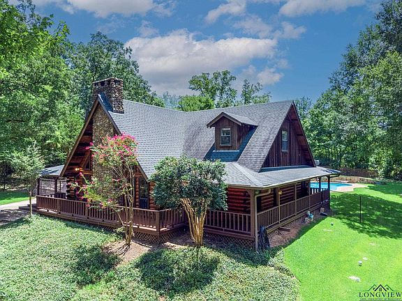 Welcome to this charming log home located north of Longview, TX. This home blends country ambiance with the convenience of being minutes from shopping and schools. Inside, you'll find 3 spacious bedrooms, including a master on the ground floor, 2 and 1/2 bathrooms. The home office is ideal for remote work or study. The living space features tall ceilings, creating a bright atmosphere. A bonus game room includes a pool table and ping pong table, both of which stay with the house. The semi-open kitchen offers ample storage. Outside, enjoy the gunite pool and the back porch, perfect for entertaining. The property spans 2.38 acres, beautifully landscaped with chain-link fenced areas, ideal for dog lovers. This log home is a perfect retreat, offering rustic charm and modern conveniences. It’s an excellent choice for those seeking a serene lifestyle without sacrificing accessibility to urban amenities. Don't miss the opportunity to make this stunning property your new home!