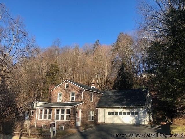 Vintage 2 family brick home in great location. One enters the main home through a glass enclosed porch then opens to kitchen, dining and living room with hardwood floors and a brick fireplace. There is a door to the completely private terraced backyard with a sunny brick patio surrounded by perennial gardens. The other unit, which is around the side with it's own outdoor sitting area is nicely renovated 1 BR 1 BA. There is a 2 car attached garage with upstairs storage. Quiet spot yet cycling distance to either the Rondout waterfront (1.5 miles) or historic Stockade district (3.5) is this nicely sited solid home with a country feel; the Millbrook stream is across the road and one other home in site yet the convenience of natural gas, municipal water and sewer. Good investment property or live in one and rent the other.