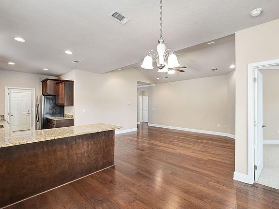 Welcome to this beautifully appointed 4-bedroom, 2-bath lakefront home in the highly sought-after Driftwood Estates. Thoughtfully designed with a desirable split floor plan, this residence lives larger than its 1,699 square feet, thanks to vaulted ceilings in the living room that create an airy, light-filled atmosphere. Each bedroom features brand new carpeting, adding a fresh and refined touch throughout. The spacious primary suite offers a peaceful retreat, complete with a well-appointed ensuite bath featuring dual vanities, a separate garden tub, and a walk-in shower--perfect for relaxation and everyday comfort. Step outside to the covered patio and take in serene lake views, an ideal setting for morning coffee or evening gatherings. A two-car garage provides convenience and ample storage, while the overall layout is equally suited for entertaining and comfortable daily living.