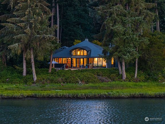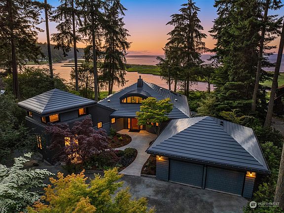 Architectural gem perched on 121' of no-bank waterfront on a natural lagoon with expansive views of Saratoga Passage. This custom 2-bedroom and den home with artist studio features modern design with concrete, wood, and steel, vaulted ceilings, and a wall of windows. High-performance SIP construction, energy-efficient windows, Stûv wood stove and geo-thermal radiant heating provide comfort year-round. The chef's kitchen boasts granite and stainless countertops, fir cabinetry, and high-end appliances. Enjoy outdoor living with easy access to paddleboarding, kayaking, AND deep-water access from the private community beach. A perfect celebration of design and nature.