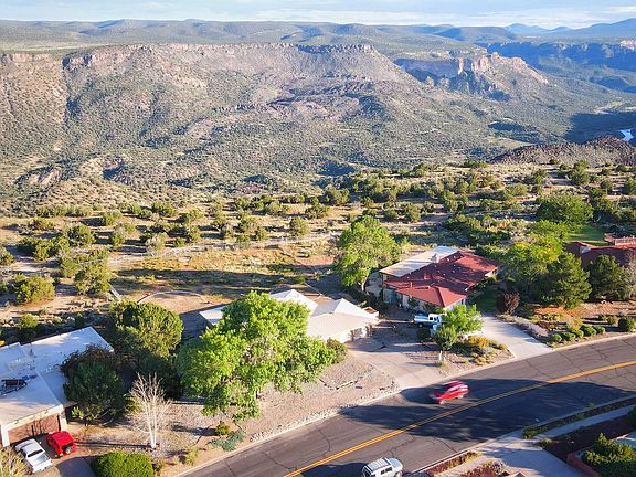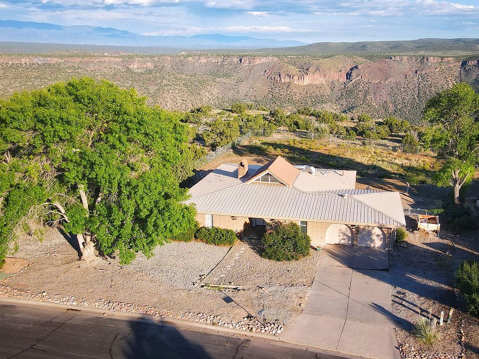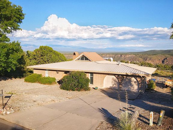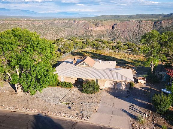 Views Views Views and a jewel of a home! You will fall in love with this home and the very large .58 acre lot, which backs to the White Rock Canyon and has views Sangre de Cristo Mountains~ Take a walk down to the river right from your own backyard! This home is a custom home and with a very unique design. Open the double front doors and immediately you will see the view through the house. This home has two living areas (or optional large dining area). The living room and fire place are at the center of this beautiful home. The bedrooms surround the living area with a hallway in between. Primary en suite has double sinks, separate shower and toilet area. Updated kitchen has granite counter tops and newer appliances. The covered patio out back is the best place to sit and enjoy the view! Let's make this house your home!