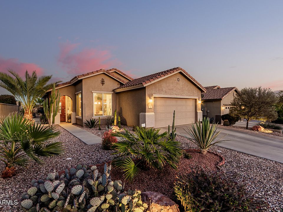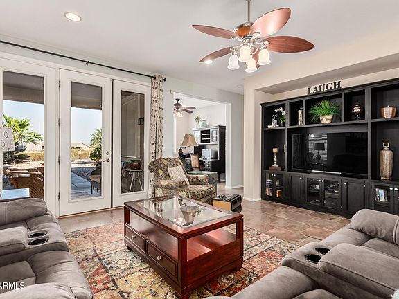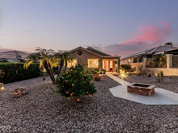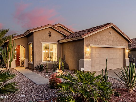 Located perfectly on a golf course in the highly sought-after Sundance Villa Community! Featuring a 2-car garage and desert landscaping, the home offers a welcoming living room with tall ceilings, a neutral palette, with engineered hardwood and tile. The eat-in kitchen is equipped with ample wood cabinetry, a pantry, stainless steel appliances, granite countertops, and a breakfast bar. The den provides versatile space for an office or play area. The spacious main bedroom includes a private bath with dual sinks and a walk-in closet. Enjoy tranquility in the large backyard, complete with a covered patio, pavers, bonfire pit, and mature trees. Plus, the home boasts a new roof, just 2 years old! The 55+ community offers resort-like amenities Nestled in the picturesque area of Buckeye, Arizona, the Sundance Active Adult community offers residents the perfect blend of serene desert living and convenient access to urban amenities. Nestled near the stunning White Tank Mountains, Sundance is surrounded by natural beauty and outdoor recreational opportunities. The community is just a short drive from the bustling cities of Phoenix and Scottsdale, providing easy access to world-class shopping, dining, and cultural attractions. Additionally, Sundance is conveniently located near major transportation hubs, with Phoenix Sky Harbor International Airport and Scottsdale Airport both within a reasonable distance, ensuring seamless travel for residents and visitors alike.