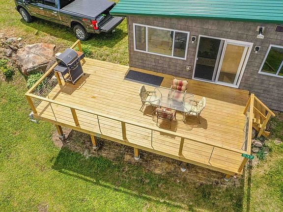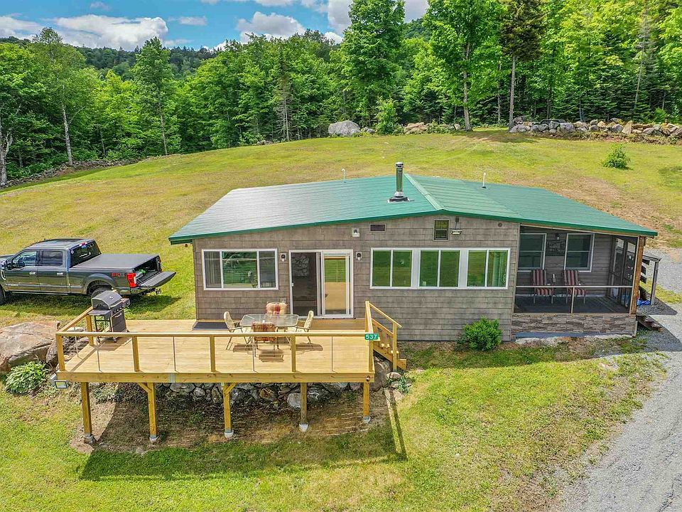 Unique opportunity to own a gorgeous cabin with breathtaking views on over 235 acres. Located less than 30 minutes from Barre or New Hampshire. Just a half mile off route 302, you will drive up the mountain to find privacy, nature and your own piece of Vermont beauty, that abuts the Groton State Forest. The cabin has all the comforts of home with electricity, water and sewer. Dining room, galley kitchen, 2 bedrooms, 2 baths and laundry. This home away from home has hardwood floors and ceramic tile floors, new carpet, vinyl siding, screened in porch and large deck. Stay comfortable in the summer with central air conditioning or after a snowmobile ride, off the VAST trail, that is located in the back yard, warm up in front of the wood stove, pellet stove or use the propane heater. Furnishings are included to make this purchase turn-key. And there is more! Hiking trails, orchards, wildlife, gardening, maple sugaring, and did I mention the views? You will be in awe of what you see from the dining room, living room, porch and deck, this view is priceless.