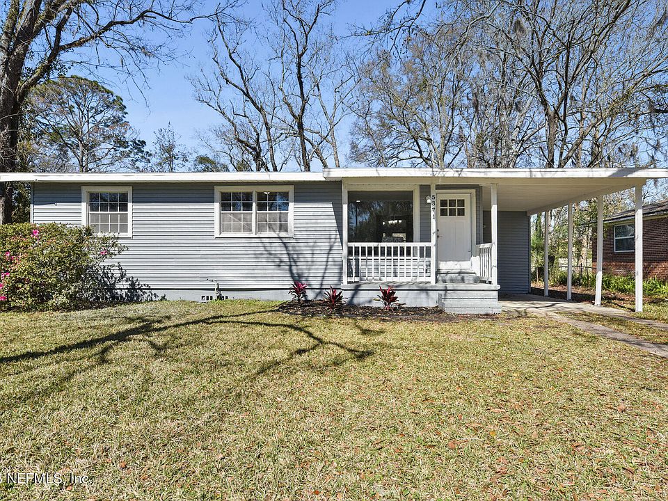 Welcome to this newly renovated home. As you pull up the home you will notice the large yard, long driveway with plenty of parking. There is an oversized Carport attached to the home. The backyard is partial fenced and good sized. As you enter into the home find a family area connected to the dining area. There is a nice galley style kitchen complete with new kitchen cabinets, new granite countertops, new tile backsplash and new appliances. Off the back of the kitchen is a large sunroom and a oversized laundry area that could hold a play area or desk to be an office. Down the hall are three bedrooms good sized with new carpet. The bathroom is large for the area with a large tub, new toilet and new vanity. The interior of the home has all new paint, new LVP in wet areas Roof 2023.