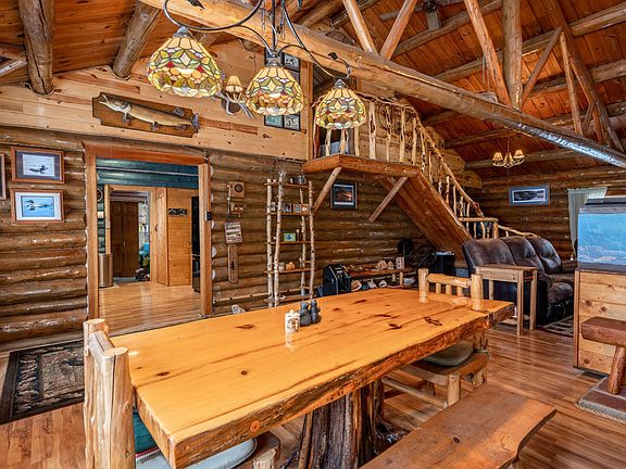 Nostalgic log cabin on a great private fishing lake with no public access. Newer roof, furnace, kitchen and appliances, well, bedroom/bath and entry addition. Gentle elevation to the lake. Large open floor plan and vaulted ceiling. Loft bedroom overlooking great room. Additional storage or guest space above garage. A great Up-North lake property and excellent fishing!