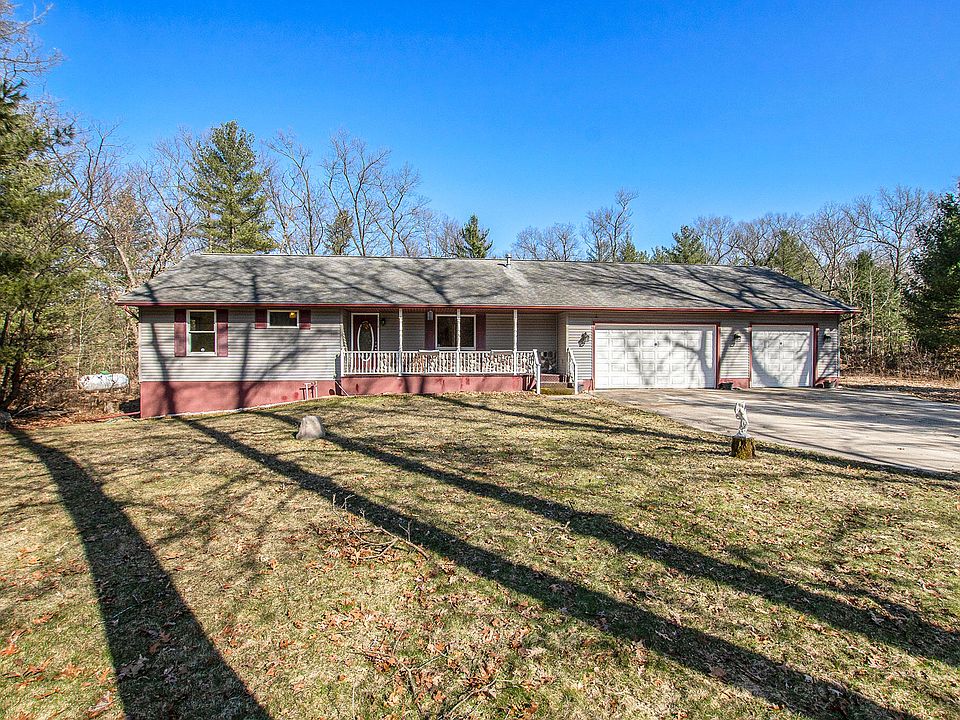 **MULTIPLE OFFERS REC'D. OFFER DEADLINE SATURDAY 4/1 AT 8:00 PM** Peaceful and private! This 3-bedroom, 2.5 bathroom ranch on 2 acres has it all, including 3+ car (extra deep) insulated garage, FULL basement with daylight/egress windows, and even a clearing in back, ready for you to install a pole barn. Fantastic floor plan, with gorgeous stone fireplace in living room and generous ceiling height for a great sense of space. 200-amp service to home, NEW furnace, central air, Andersen windows, Leafguard gutters with transferable lifetime warranty, and underground sprinklers in front yard. Enjoy the abundant wildlife from the covered front porch, or from the back deck. All appliances stay. Oversized garage - 3rd bay is 29 feet deep - plenty of space for workshop + boat. Reeths-Puffer schools