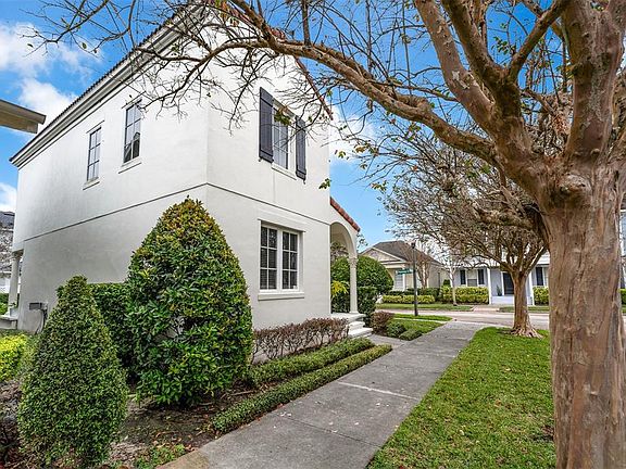 Step into this elegant Modern Mediterranean 3-bedroom, 2.5-bath home on a corner lot, where warm hardwood floors, fresh exterior paint, and timeless crown molding set the tone for elevated everyday living. With its striking tile roof, in-ceiling audio speakers in the living room and porch, and refined details throughout, this beautifully maintained property delivers comfort, quality, and curb appeal in one exceptional package. The spacious, open-concept kitchen is the heart of the home—featuring 42" cabinets, granite countertops, stainless steel appliances, a built-in desk area, and a well-appointed pantry. It flows seamlessly into the great room for easy entertaining and everyday living. Upstairs, three bright bedrooms feature hardwood floors and abundant natural light. The conveniently placed laundry room adds to the home's practicality. All bathrooms include marble countertops and 18-inch tile for a polished, timeless look. Outdoor living shines with an extended brick paver patio and mature, zero-maintenance landscaping—ideal for hosting or relaxing. Located on a quiet, low-traffic street with ample guest parking, this move-in-ready home is zoned for top-rated Baldwin Park Elementary, Glenridge Middle, and Winter Park High. The community of Baldwin Park is pre-wired for high-speed fiber internet, and 1GB service is included in the HOA. Residents also enjoy access to community pools, scenic trails, a fitness center, charming shops, popular restaurants, and a vibrant neighborhood atmosphere—all just minutes from Winter Park, Downtown Orlando, and world-class attractions.