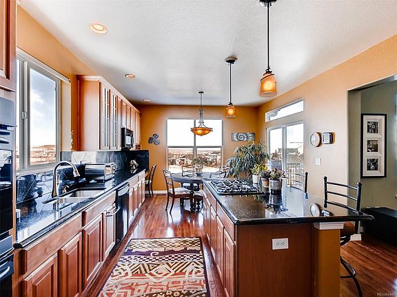Outstanding View Property! Absolutely stunning main level living with walkout basement situated at the top of the subdivision overlooking park and front range! Sit on this inviting deck, admire the scenery, watch the wildlife, sip your coffee! All the bells and whistles are here in this immaculate, show home condition property! Hardwoods, new carpeting, designer décor, wide open floorplan! This is main level living at its finest! Warm maple cabinetry, stainless, granite, gas cooktop, double ovens, even the kitchen nook has views! Master retreat is ready to enjoy with sitting area, bay window and private bath! Modern fixtures throughout, huge basement area with pool table, exercise area, TV area with surround sound, walkout basement is light and bright - must see to appreciate even the basement has views! Two outdoor entertainment areas, invisible fence for pets, solar panels increase your savings, adjacent to the park, walking trails - best location in the subdivision!