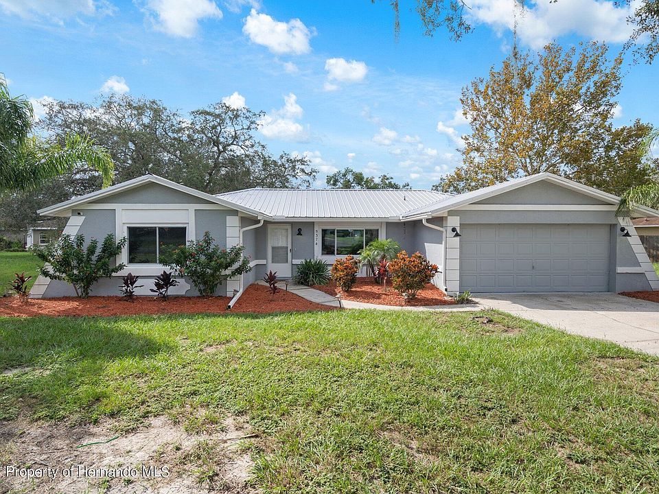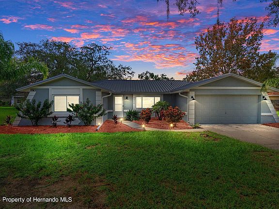 A RARE find on 1/2 an acre in Spring Hill on a corner lot. Completely renewed and modernized 3-Bedroom, 2-Bath, 2-car-garage home. A remarkable transformation that showcases exquisite craftsmanship and attention to detail. New Waterproof vinyl plank flooring, ceiling fans, baseboards/trim, interior 6 panel doors and interior/exterior paint throughout. Remodeled Kitchen includes new stainless-steel appliances, granite counter tops, wood cabinetry with soft closed doors & drawers and updated fixtures. Remodeled Bath with new tile, vanity, granite countertop and stunning vessel sink. Split Bedroom Plan. Expansive family room perfectly situated just off the kitchen with sliding glass door to the screened rear patio overlooking the expansive yard. Enjoy the convenience of the interior laundry room featuring new cabinetry. Other NEW items include door hardware, both exterior swing doors, all outlets/switches, all vents, barn door, wire rack shelving, disposal, texture on walls/ceiling, smoke detectors, and firepit areas. Other incredible features of this home include metal roof, landscaping, sliding glass doors from the master to rear lanai, double hung - dual action low E vinyl windows, kitchen island with plenty of room for barstools, LED can lighting in main living areas, and frames for lanai for vinyl windows. Conveniently located near a multitude of local amenities. WHO DO YOU KNOW......that needs to book their private showing to make this their new home? Call us Today!