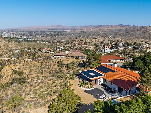 Discover a modern oasis at 53744 Ridge Road, situated high above Yucca Valley. This exquisite 3-bedroom, 2-bathroom home (one bedroom currently being used as a den) of Contemporary Mediterranean design spans almost 2000 square feet, and is located on a sprawling 81,000 square foot lot. It offers a seamless connection to the surrounding hills and boulders and must be experienced firsthand. The carefully renovated modern home sits at the very top of Ridge Road. The views radiate out from the home and encompass the nearby mountains and boulders, but also jetliner views of Yucca Valley and the desert beyond. As you move through the house, each room has a unique and different view and perspective where large windows frame the changing light and scenery while showcasing dazzling, beautiful vistas that just stop you in your tracks. Step inside and you will find the space pays homage to those views by keeping it simple, featuring a blend of minimalist contemporary design with a zen-like calmness. The open floor plan features sleek, high-quality finishes and expansive gallery walls, perfect for displaying your art collection. Energy efficiency is a priority, with a solar panel system and battery backup in place. The property has access to hiking trails and generous outdoor space, providing the perfect backdrop for both entertainment and relaxation. Positioned in the prestigious and sought-after Yucca Valley Country Club Estates, this home seamlessly combines privacy with panoramic vistas, making it an ideal retreat. Experience the allure of modern living in a setting that embraces and enhances the beauty of its natural surroundings.