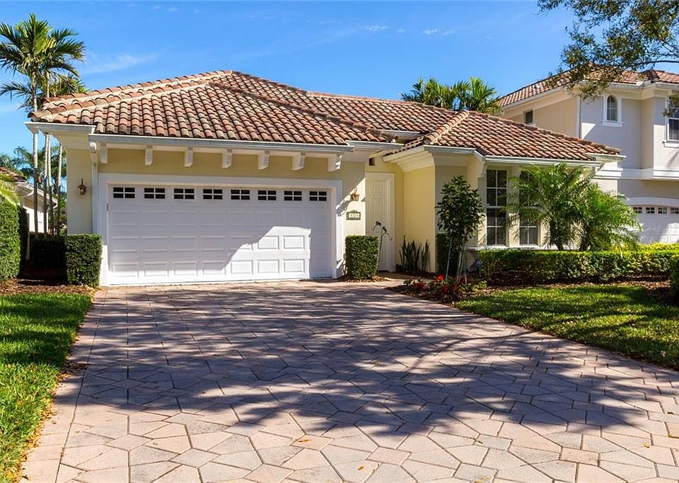 One story detached courtyard home w/guest cabana. Larger private pool with brand new heater. Spacious covered, screened porch spans living/dining room with views of pond & golf course. Storm shutters, volume ceilings, renovated kitchen. Generator. Pristine condition. Owners motivated to sell .Golf/tennis membership avail. Sizes are approx and subject to errors.