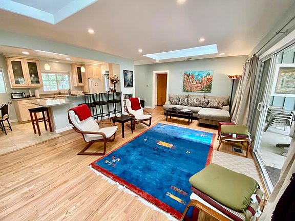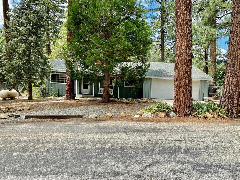 Your Zen Retreat in the mountains awaits...Come relax and unwind in this 3 bedroom, 1.75 bath, 2-car attached garage home on a large flat, cul de sac lot that slopes down to Lily creek and the perimeter trail of the County Park. The light and bright interior features an open concept living, dining and kitchen area that are illuminated by skylights and large windows exposing the tree lined rear yard. Beautifully remodeled throughout with oak & bamboo flooring, the gourmet kitchen features a dining area, breakfast bar, gorgeous Corian counters, and pendant lighting. The Living Room has a warm brick hearth with wood stove insert for those cold winter nights. Large windows and slider bring the outdoors in. The Primary bedroom is separate with great storage, private 3/4 bath and door to the patio. Two additional bedrooms are on the other side of the house along with a large full bath. An attached, 2 car garage makes getting in and out a breeze. A nice covered Patio overlooks the partially fenced lot - great for dogs and great for sledding. The street is county maintained and is a cul de sac offering seclusion. One level, easy access, remodeled, maintained and walk to town!