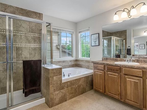 This beautiful single family home has 4 bedrooms, 2.5 baths, 2 car garage, new HVAC system for central air, and finished basement. It also has a large kitchen with granite countertops, stainless steel appliances, double oven range and ample cabinetry. Wrought iron railings, neutral paint & carpet, spacious family room with fireplace, low maintenance yard with trees, and new stamped concrete patio. Large master bedroom with fireplace, walk-in closet, 5 piece bath with oval soaking tub, upstairs laundry, and finished garage with floor coating.