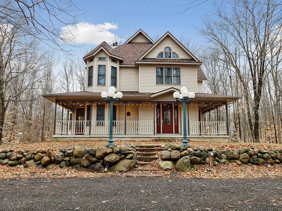 Spectacular Victorian Home situated on over 17 wooded acres of beautiful hardwoods. Drive down the breathtaking winding drive that opens up to the view of this beautiful home with many features. A grand fire-lit living room with access to wraparound porch and amazing view out of the large bay window. A spacious formal dining room, a new kitchen with a large island, granite countertops, stainless steel appliances and a stylish dinette with fireplace and sliding door access to the gorgeous pine sunroom. Stairs lead off the kitchen area up to a sizeable bonus/bedroom complete with cedar walls and ceiling. French Doors lead to the office/study with a large bay window that is part of the front entrance turret. Walk up the staircase and enjoy the sitting room with plenty of natural light. The master suite is complete with the bay window at the top of the turret, hickory flooring, two walk-in closets, a spacious bathroom with bidet, shower and corner jetted tub. Enter via the winding staircase to the perfect meditation prayer room. There are two sizeable bedrooms connected by a Jack and Jill bathroom. Ceiling fans in all the bedrooms, hardwood floors throughout main level, master bedroom and bonus/bedroom, Anderson Windows throughout. Outside enjoy the large wraparound porch while watching all the wildlife. Store all your outside toys in the 32 x 48 pole barn with separate 100 amp service. New propane furnace in 2018 and wood furnace in 2017. New roof in 2020.
