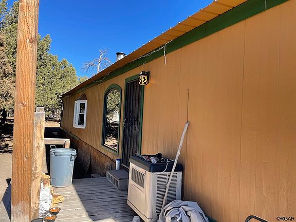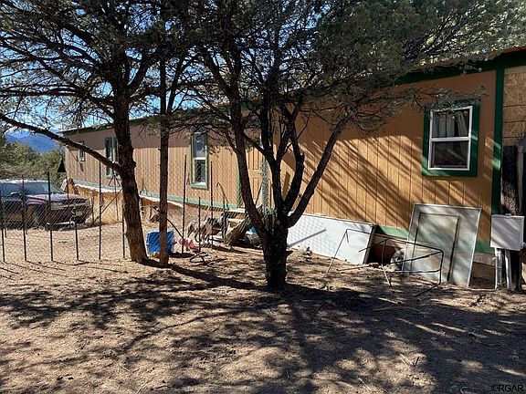 Ranch style manufactured home (14x 65) is surrounded by pine trees and Mountain views of the Sangre de Cristo Mountain range. Has had upgrades in 2020 including: Doors, windows, wiring including 220, Pex plumbing, drywall, metal roof, flooring, lighting, pump, electric water heater, tile shower and tub. Power, great well, propane tank and septic are all in place. 5 outbuildings, including and underground greenhouse (50 X 14). Field is tilled and ready to be planted. Sun exposure from East to West is great for farming. Well permit states that it pumps 3 Gal. per minute. Parcel #99204119 is next to this property and can be sold together. Please watch the virtual tour!