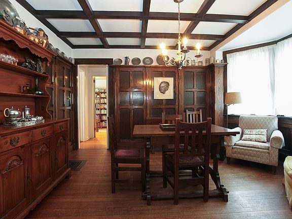 Historic Dutch Colonial on quiet street with extraordinary interior details, including living room with chestnut & oak paneling, beamed ceiling and fireplace. Charming front screened porch. Spacious family rm extension with cathedral ceiling, built-in bookshelves & adjoining full bath. Three generously-sized bedrooms on second floor plus finished room in attic. Located one block from town playground, two blocks from elementary school and three blocks from downtown.