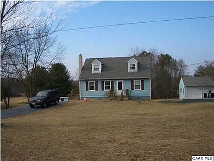 This is a great location-12 mi.from C'ville city limits!! Very spacious w/4 bedrooms/2 baths. This Cape Cod is larger than it appears w/finished walk-out basement, spacious eat-in kitchen, bright living room-over 2200 sq. ft. on 2 scenic acres. Paved driveways with detached 4 car garage(768 sq.ft.), plus an additional oversized 14x24 garage (336 sq.ft.) w/10 ft. ceiling - great for storing RV/Boat/or lg. vehicle. More than you could expect to find at this price-so close to C-Ville, & I-64.