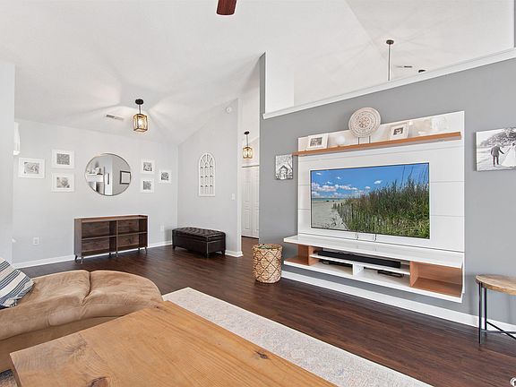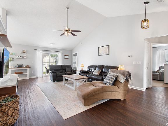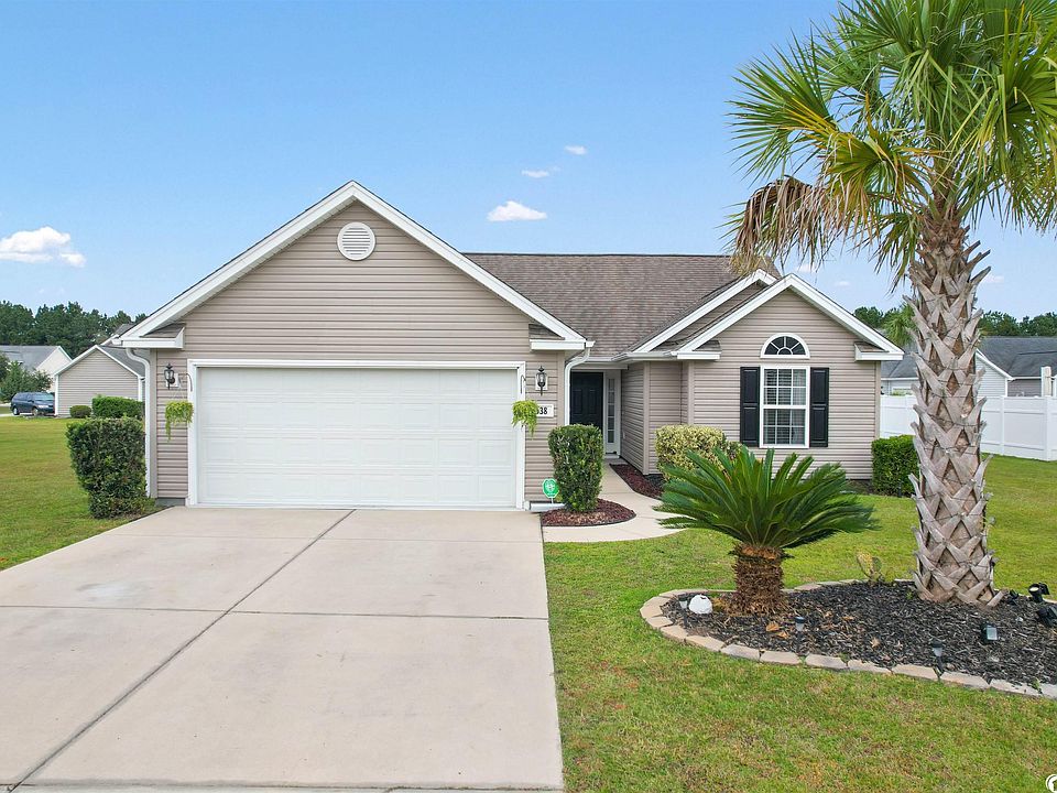 Welcome home to this lovely 3 bedroom 2 bathroom home located in the Carolina Woods subdivision in Myrtle Beach. This beautiful home features a spacious open layout with vaulted ceilings, LVP flooring throughout the main living areas, a plethora of natural light, attached garage and fenced in backyard! The front door opens to a quaint entry way overlooking the open concept living room. The main living area has vaulted ceilings, a costume made modern entertainment center and is flooded with natural light from the windows and sliding glass doors which lead your eye onto the back patio and fenced back yard with a pond view. To the left of the living area is the updated kitchen. The kitchen boasts stainless steel appliances, a large pantry, eye-catching quartz countertops, a laundry closet, as well as access to the garage. Just beyond the kitchen is the dining area providing ample space, natural light and a great view. To the right of the living area is the master bedroom which provides a walk-in closet, a en suite bathroom with a standing shower, a large vanity with sink, a toilet and linen closet. To the right of the entryway is the guest bathroom that has a shower / tub combo as well as a vanity with storage and a toilet. Adjacent to the guest bathroom are the 2 guest bedrooms. Both guest bedrooms provide good size closets, ample natural light as well ceiling fans, with one featuring vaulted ceilings. This home is located in a peaceful area of Myrtle Beach just 15 minutes from the beach as well as local shops and eateries. Schedule a tour today and buy this home tomorrow!