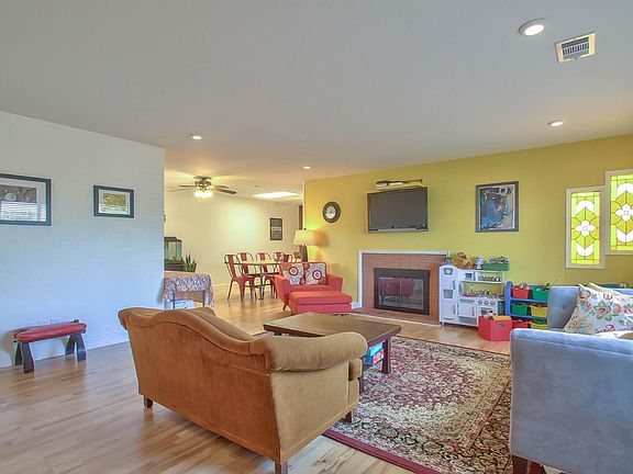 This sweet home on a large corner lot is sure to please. The large open living room welcomes you in and is equipped with a wood-burning fireplace engineered hardwood flooring through out the living space and both bedrooms. The updated bathroom features new tile floors, pedestal sink and skylight to bring in the natural light. The clean and functional kitchen is attached to a large dinning area that has plenty of room for all to enjoy a meal and time together. The dinning space is large enough to accommodate a large family style table and is equipped with built in cabinets for extra storage. The private fully fenced back yard has a lovely patio and just enough grass to enjoy some green space while relaxing and unwinding at the end of the day or enjoying a nice soak in the hot tub to erase the stress of the day away.