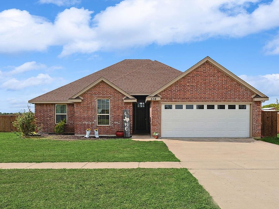 A rare opportunity to own a stunning home combining peace and accessibility in the highly desired Crow Estates addition of Whitesboro! Inside the home you will find an open concept floorplan in the living room and kitchen area with a beautiful stone fireplace, kitchen island, upgraded fixtures, granite countertops, and more. Off the kitchen is the dining nook spacious enough for a full sized table. The two guest bedrooms have their own space in the home with a full bath featuring an oversized vanity and shower tub combo. The large primary suite is on the opposite side of the home with dual vanities, a separate shower, and a large walk in closet for storage. The oversized utility room is off that hallway with built in cabinets and counter space. Out back is a massive, fenced in yard with a view of the neighboring pasture providing peace and tranquility. The home has a country feel with all amenities close by, and sits on almost a half acre lot. Do not overlook this gem in town!