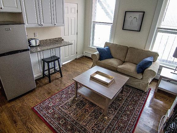 Available now Fully furnished, heat and hot water are included. Wifi is included. The one-bedroom unit has a kitchen that is fully-equipped with appliances, including refrigerator, range with oven, microwave, pots/pans and cooking utensils. There is a 32in flat screen TV with local channels located in the living room. This unit has a dining table with seating for two that can also be used as a desk. The bedroom has a full size bed, dresser and plenty of closet space with additional storage above. There is hard wood flooring through-out the unit and high ceilings as well. The unit gets great light and has views of the city.