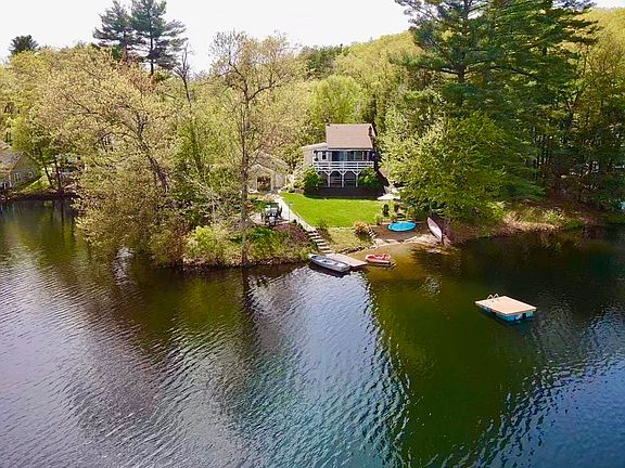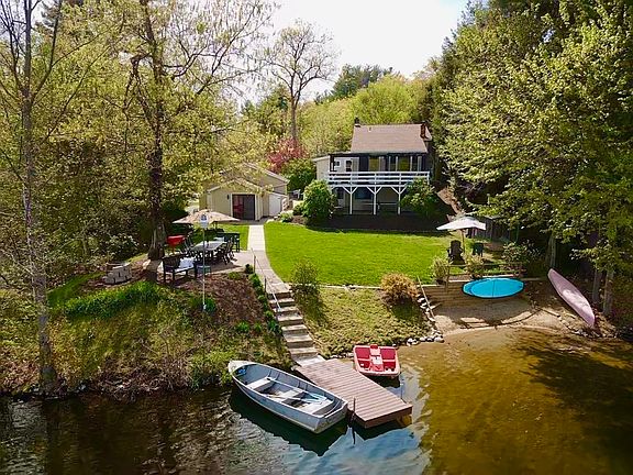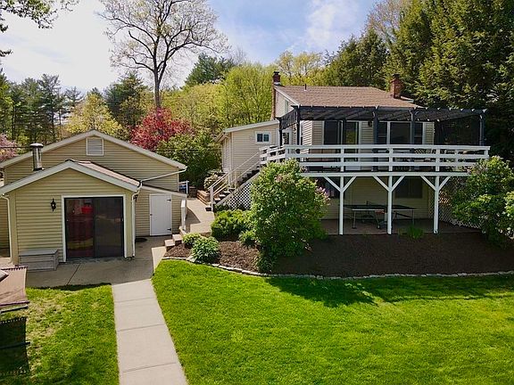 Unbelievably charming lake home with 192 feet of frontage on Lake Arcadia. Enjoy your own dock and private beach! The open floor plan with stunning views of the Lake right from the kitchen, living room or walk through the sliding glass door to the massive deck. Great place for entertaining. The morning sunrises over the mountain across the lake are breathtaking. Huge back yard with concrete patio & fire pit down at the lake for those summer Lake parties. Newly remodeled bathroom offers plenty of space. Great main bedroom with vaulted ceiling is perfect to kick back an just relax. Basement has the two other massive bedrooms which also has been remodeled that have great views of the Lake. Remodeled over the years, Central air & more! Bonus room off garage perfect for a game room or just a quiet getaway. This home is not just your typical home, it is vacations and family parties for generations to come. Fishing, swimming & winter sports too! Only 10 minutes to Amherst Center.