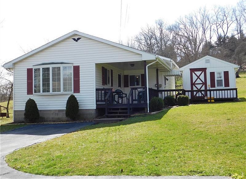 Absolutely darling, vinyl sided 1 story cottage on a beautiful 1/3 country lot!!! great room w/beamed cathedral ceiling, bow window & corner gas fireplace; dining room; eat in kitchen w/ easy care for Formica cabinetry; sweet bed room with double closet; nice bath w/ ceramic tub surround, wide vanity, shell shaped sink & linen closet; laundry room; fully insulated, walled, floored attic w/pull down steps & electric; roof - 1 year old; Carrier furnace, central air & new 150 amp electrical box & service line just installed; 20x18 + L shaped covered porch, 16x12 storage shed; proudly offered with a 1 year home warranty!!!