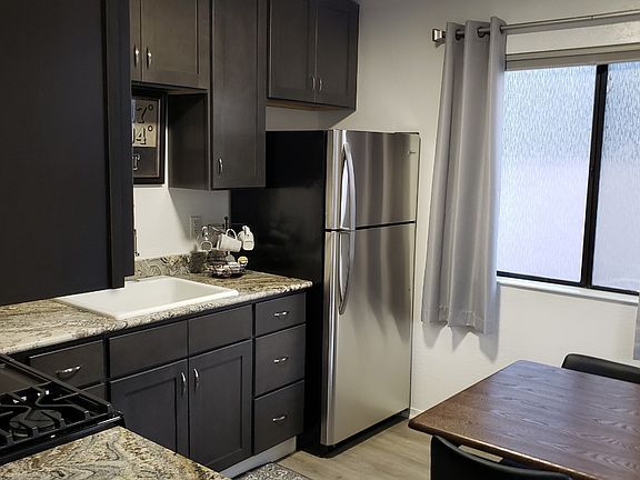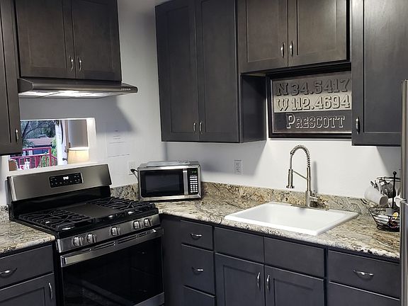 We call this the Golden unit. This upstairs 850 sf unit is in the heart of Prescott, just minutes from the Courthouse Plaza and features 2 bedrooms, each with a queen bed, plus one bathroom. Lots of fluffy towels and bathrobes await you. The front balcony offers seating for two to enjoy morning coffee or 5:00 o'clock cocktails. A common dog area fully stocked with supplies is nearby. A coin-op laundry room with complimentary wash and laundry supplies is on site. Assigned parking with security cameras in the parking lot. Conveniently located to downtown, the rodeo grounds, and within walking distance to Granite Park with 5 acres of fun. Shopping and restaurants are close as is Fry's grocery store, Dignity Health hospital, and WalMart. Amenities include two Smart TVs, Wi-Fi, shampoo, conditioner, soaps, hairdryer, ironing board and iron. Kitchen with granite countertops and stainless steel appliances is fully stocked with everything you will need, including French Press coffee, K-cup, and Mr. Coffee machine. Come relax with us!