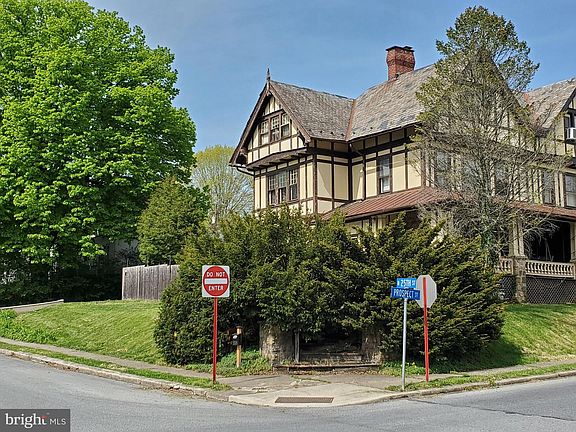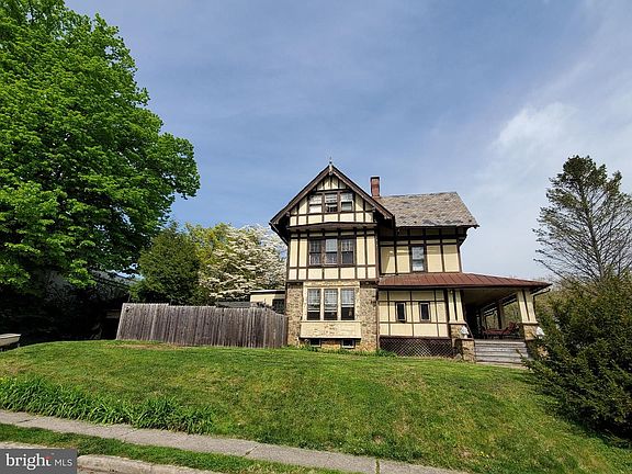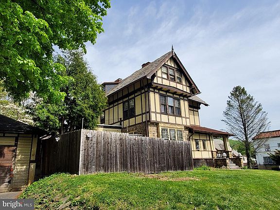 This home is sold in AS-IS condition. Some vision, hard work and investment is needed to restore this large stately Tudor home. This twin home is a one of a kind landmark, but needs restoration to bring it back to its original beauty. The main level includes a large living room with brick fireplace and hardwood floors. Large dining room includes hardwood floors and ceiling fan. The kitchen features updated cabinets with granite countertops and tile backsplash. There is a 5 burner gas range, built-in microwave and refrigerator included with the sale. The main level laundry adds convenience and includes a half bath and laundry tub. The 2nd floor features 2 large bedrooms, library/office area and full bath tile floor, 1/2 tile wall and tub/shower. The third floor consists of 2 large bedrooms and full bath with shower. The home's exterior features include a large front wrap around porch, rear patio courtyard with 7 person hot tub, and detached garage. Please note that due to an active roof leak, cash, or conventional renovation style financing only.