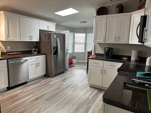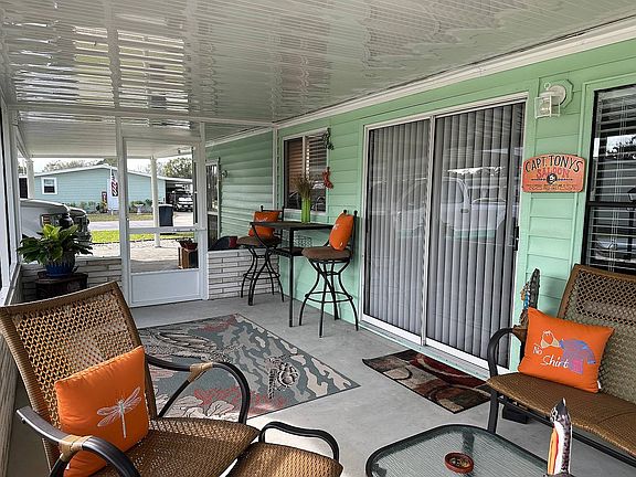 Awaits you in this immaculate spacious completely refurbished home. Freshly painted inside and out. All new fixtures, wall outlets and ceiling fans recently replaced. New kitchen cabinets and appliances in 2022. All new plumbing throughout, new porch 2022. All new air conditioning ducts and new insulation underneath this 1500 sq ft home. Home was releveled and reset as well as anchors retightened. All new screens in entire home. Located in a sought after 55 community with numerous activities and amenities.