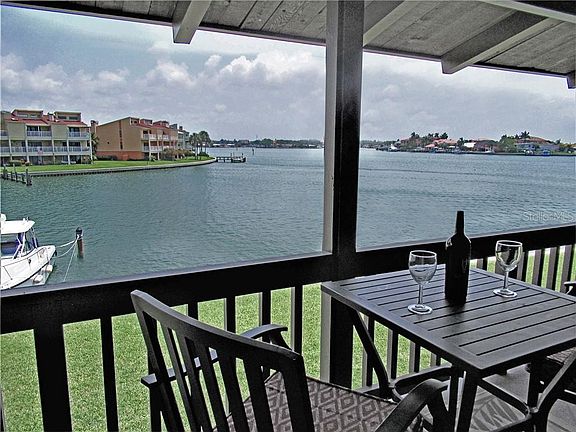 You will LOVE the views of Boca Ciega Bay from your new STAY-cation getaway from the second floor covered balcony! The soaring vaulted wood ceilings add a feature rarely found in condos and are complimented by the beautiful excellent condition wood laminate flooring. Open concept unit has an updated kitchen with wood cabinetry, granite counters and stainless color appliances open to dining and living areas. Back door leads to stairway down and out to waterfront/ground level for convenience. Master Bedroom is spacious and fits king size furniture, and features the gorgeous vaulted wood ceilings, beautiful laminate flooring, and double large closets. Master bathroom has granite/ebony vanity with double sinks and updated step-in shower with seating. Bedroom #2 has double closets and wood laminate flooring. (Murphy beds/desk do not convey). Hall bath has tub/shower combo and updated vanity/lighting. Large storage closet in the unit with attic access with additional storage. Trane Central H & A and newer H2O. La Costa Brava is only minutes away from Treasure Island beaches/restaurants and has amenities such as waterfront heated/cooled pool, fishing dock, slips available on a 1st come basis only $600 per year (please verify with assoc.), clean, bright & spacious community laundry and grilling area. Assigned parking space #70 right outside the building. Room sizes are approximate.