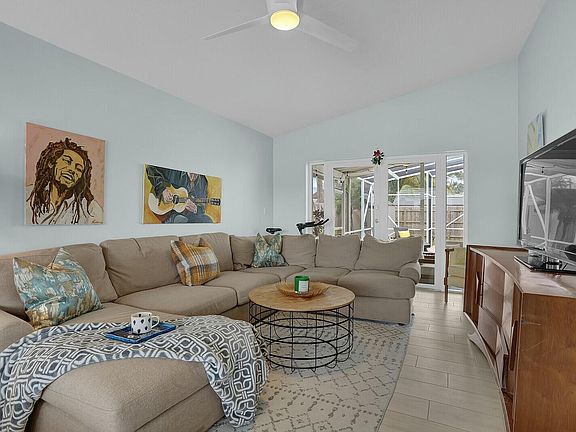 This beautifully upgraded vaulted-ceiling mid-century single-family home in Palm Beach Gardens features 3 bedrooms and 2 bathrooms, with no HOA fees. Recent renovations include a new roof (2018), solar panels (2022), HVAC (2022), upgraded plumbing, and new electrical systems (2022).The interior features coastal porcelain tile, a contemporary kitchen equipped with s/s appliances, and renovated bathrooms. It offers seamless indoor-outdoor living, highlighted by a spacious covered patio that leads to a private pool, which is enhanced by a new oversized screened enclosure, ideal for entertaining. Additional highlights include a spacious carport, extra storage, a fenced yard suitable for children and pets, new landscaping, and ambient poolside lighting. This property is truly a must-see