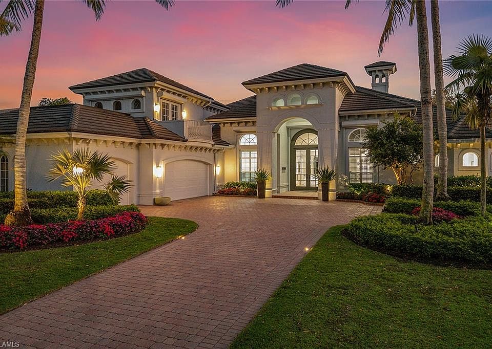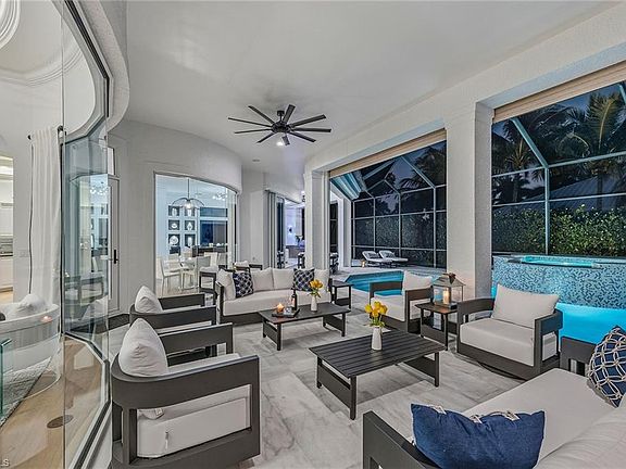 Set on a picturesque, tree-lined street in The Moorings, this elegantly reimagined residence offers an elevated coastal lifestyle in one of Naples prestigious neighborhoods. Encompassing 3,871 square feet of sophisticated interior space, this four-bedroom plus study, four-and-a-half-bath home showcases a layout thoughtfully curated for refined living and effortless entertaining. Inside, newly installed 8-inch-wide oak plank floors add warmth and texture, flowing seamlessly through the open-concept living spaces. The formal living room is anchored by a gas fireplace, while a soaring ceiling and bespoke light fixture define the dining area with architectural distinction. A custom media wall elevates the family room experience, blending form and function. The kitchen is a chef’s retreat, tastefully updated with premium appliances, quartz surfaces, and contemporary finishes that marry aesthetics and performance. All baths throughout the residence have been meticulously redesigned, featuring designer tilework, custom vanities, upscale fixtures and lighting. The primary suite is a sanctuary unto itself, offering dual custom closets and a spa-style bath that reflects a commitment to craftsmanship and comfort. Additional enhancements include a generator, Sonos home audio, designer lighting throughout, LED recessed fixtures, and new hurricane-rated garage doors enclosing the spacious three-car garage, which also features built-in cabinetry and a workbench. The outdoor living area has been transformed into a private resort setting. A saltwater pool and spa finished with new tile are framed by a marble paver deck. The expansive covered lanai and newly constructed summer kitchen invite year-round alfresco dining and entertaining, surrounded by lush landscaping and privacy. This exceptional property offers rare access to the coastal amenities of The Moorings, including proximity to the neighborhood’s private beach access, world-class shopping, dining and more. A seamless fusion of modern luxury and timeless style awaits.