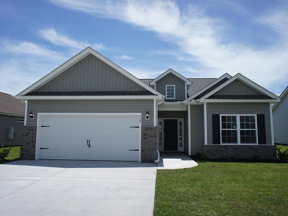 Beautiful Hatteras floor plan in the new Ocean Palms community. This terrific open floor plan, 3 bedroom, 2 full bath home will have an upgraded live dormer double height entry way, upgraded waterproof LVP flooring under soaring vaulted ceiling in the family room, kitchen and dining area, and comfortable carpet in the bedrooms. Stainless appliances, staggered-height grey painted cabinetry with added under cabinet lighting, and a convenient granite breakfast bar combine to give you the wow factor you're looking for, and abundant recessed lighting plus three large windows in the adjacent dining area flood the room with light. A French door in the great room leads to the covered rear porch and the large separate patio beyond. The spacious master retreat features a long vanity, an oversized walk-in shower, plenty of storage in the linen closet and a huge walk-in closet, plus a tray ceiling. Two additional bedrooms and a full bath are tucked off on their own hallway, for privacy. All of the homes in Ocean Palms come standard with the luxury of natural gas (tankless water heater, gas heat, and gas range). This home has an extended 20 x 24 garage completely trimmed and painted, and a floored attic storage space is accessed by drop-down stairs. Ocean Palms is conveniently located near shopping, restaurants, schools and world class medical offices and hospitals, and only a short golf cart ride to Surfside Beach's gorgeous beach and the beautiful Atlantic Ocean. Other floor plans and inventory homes may be available, and CUSTOMIZATION OF FLOOR PLANS IS POSSIBLE!!! Community Pool and Cabana are now open! Photos are of a completed, similar home and may have different features.