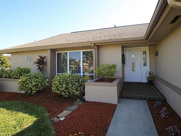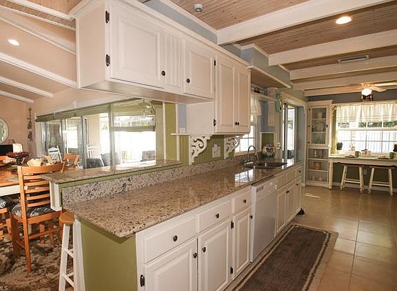 This immaculate, corner lot, 2 bedroom 2 bath home is beautifully updated with gorgeous woodwork, granite countertops & tile flooring throughout. The chic kitchen features a custom breakfast bar and hutch, pull out drawers in all lower cabinets, tongue and grove plank ceiling, 2 pantries, sliding glass door and pass through window to lanai. 2 masters closets are positioned directly off the master bath while the master bedroom embodies another closet, large window and impressive sliders. The wood beamed vaulted ceiling in the spacious great room is accompanied by a 16' wall of pocket sliders that expand to the tranquil oversized lanai, stylish pergola, tiled patio and professionally landscaped fenced in yard. Additional features and extras that this property offers; ceiling fans throughout, crown molding, keypad front door, huge floored attic with pull down stairs, manabloc plumbing, automatic sprinklers, hurricane shutters, abundant interior closets, 3 exterior sheds, newly painted exterior, plenty of room for a pool & close to restaurants and shopping. This home is more than MOVE IN READY. It's quality, detailed, fresh and spotless. It's a true GEM!