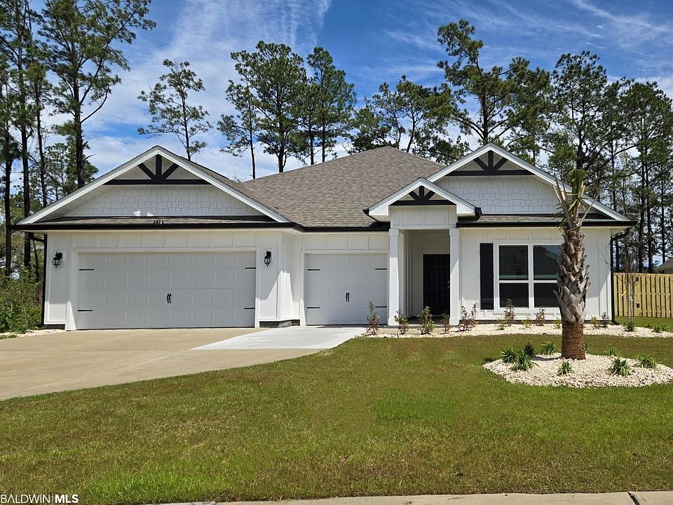 Welcome to Aventura located in Gulf Shores. This Camden floor plan is a 2785 square foot home located just minutes away from the beach and shopping centers. It features a spacious open floor plan, perfect for modern living. The house boasts four bedrooms, providing ample space for a growing family or accommodating guests. There are also 3.5 bathrooms. This home also features an in-suite that offers a self-contained living space with a bedroom, full bathroom, walk-in closet, and a mini kitchen. It provides comfort, privacy, and functionality, making it an ideal accommodation for guests, extended family members, or even as a separate living space for multi-generational households. EVP flooring throughout, quartz in the kitchen and bathrooms, beautiful cabinetry with soft close door feature, and a large island open to the great room. The master suite features a soaking tub, separate shower, double vanity sinks, a large walk-in closet. This home also features our Home is connected smart home technology, which includes a control panel, doorbell, smart code lock, and thermostat. All control by one app. The home also includes a three-car garage, offering plenty of room for parking and storage. The exterior of the house is adorned with Hardie board siding, known for its durability and attractive appearance. Additionally, this home comes with a Gold Fortified certificate, indicating that it meets high standards for storm resistance and protection. Whether you're looking for a comfortable family home or a vacation retreat, this property offers a combination of practicality, style, and proximity to desirable amenities.