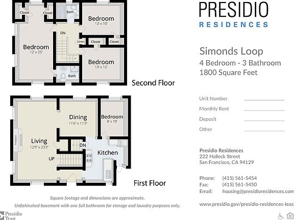 The Presidio Residences is pleased to announce the availability of 538-A Simonds Loop. Simonds Loop is located on the eastern edge of the park between the Lombard Street and Presidio Avenue Gates. The neighborhood consists of 30 Mission-style duplex homes and one single-family residence built for officers' just before World War II. The homes have a separate dining room, a living room with a large picture windows, and a spacious master suite. The homes also features a storage and laundry hook-up basement, as well as an attached one-car garage. 538-A Simonds Loop is a 4-bedroom, 3-bathroom duplex with approximately 1800 sq. ft. The starting bid of $8800* for this remodeled home features beautiful historic details, stainless steel appliances, hardwood floors, basement space for storage and laundry and an attached garage. We will have an Open House on Friday, March 4, 2022 from 12:00pm 1:00pm. We will begin accepting bids for the home March 4th. Also, we will be featuring these upcoming Simonds Loop homes: 530-B Simonds Loop starting bid $9200*. This home has an extra 425 square feet of living space in the semi-finished basement 539-A Simonds Loop starting bid $8700* Bidding Information: initial monthly rental rate lease commencement date lease term-1 year minimum annual rent escalation factor % All applicants must meet the Presidio Trust's standard residential screening criteria. This includes, in part, credit check, criminal background check, verification of income and assets, and verification of past residence. Submittals will be evaluated based upon proposed financial terms and proof of ability to perform. The Presidio Trust and Presidio Residences will evaluate all submittals and conduct the selection process. The Presidio Trust is the sole and final decision-maker regarding this selection, and reserves the right to reject any or all proposals or terminate lease negotiations at any time, and to modify or suspend any or all aspects of the process. Additional Information: Parking permits for each additional vehicle is $75 per month 3 cars maximum Two household pets are permitted with an additional $500 deposit per pet, and a pet rent of $50 monthly per pet. Current vaccination records, spaying/neutering records, emergency caregiver contact information, and veterinarian contact information are required We want you to know that your health, along with the health of our residents and team members, is our highest priority. Prior to touring, a leasing agent will go over our COVID-19 Health and Safety Precautions with you. Wearing face masks for those who are unvaccinated is required during the tour Please do not attend the open house if in the past 10-days, you have experienced fever or chills, shortness of breath or trouble breathing, cough, fatigue, muscle or body aches, headache, sore throat, congestion, or runny nose not attributed to allergies, new loss of taste or smell, other flu-like symptoms Get to Know the Presidio Events Food Golf PresidiGo Shuttle Trails Biking Community Amenities Full Basements with Bath Historic Detail One Attached Garage Space One, Two and Three-Year Leases Apartment Amenities Bridge Bay and City Views Hardwood Floors Spacious Bedrooms Washer and Dryer Hook-Ups Monday - Friday 9:00 AM - 6:00 PM Saturday 10:00 AM - 4:00 PM Our office is closed on Sundays. Federal law prohibits housing discrimination on the basis of race, color, national origin, religion, sex, familial status, or disability.
