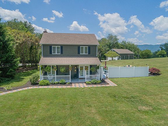 Incredibly charming home on 4 acres near Botetourt Golf Club is within 10 minutes to Daleville and offers a sense of privacy, rocking chair front porch & large painted concrete patio for entertaining, open pasture, a stream, 2 driveways, detached 26x32 garage/workshop with loft and fiber internet. 2-story guest wing addition in the late 80's doubled the home size, which now features Andersen Casement Windows, cedar siding, an open Kitchen/Living room with hardwood floors, stone fireplace with gas logs, Dining Rm with brick floor & built-in hutch, a back foyer & office/studio, updated laundry room, plus a full bath & bedroom on entry ; 2'' blinds throughout, dual zone HVAC; walk-in attic. Recent updates by owner include: New gas logs & FP mantle, new ceramic tile in office/studio/foyer &