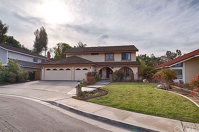 Wonderful Anaheim Hills Home in a great area located on a cul-de-sac. New interior paint throughout, new carpeting downstairs. New flooring in kitchen and bathrooms and powder room. 2232 square feet of living space that appears much large with lots of storage and a 3 car garage. The gated courtyard in the front offers an area for a private patio As you enter the home through an oversized wood carved front door, you are greeted by the large living room with new carpeting, which runs throughout the living room, dining room and up the stairs and hallway. Kitchen offers new granite counter tops, new dishwasher, garden window, new laminated floor and a large casual eating counter. The family room offers new carpeting, built-in bookshelves, newer windows and French doors out to the back yard. A large guest closets with storage and direct garage access door to the garage are found in the family room. Powder room is located near the family room. The back yard has new sod, a large patio slab and lots of beautiful trees for privacy and shade. Upstairs you will find 4 bedrooms and 2 full baths. The oversized master bedroom has large window that overlooks the back yard, a fireplace, mirrored wardrobe plus a walk-in closet. There are 3 other bedrooms upstairs that provide lots of space and storage.