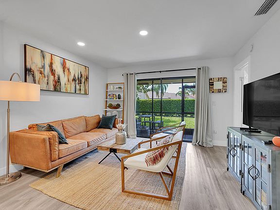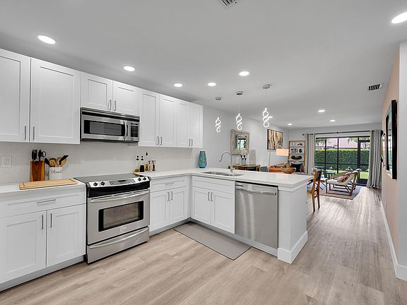 ATTACHED CORNER VILLA FEELS LIKE A SINGLE-FAMILY HOME! Price reduced by nearly $20,000. Renovated 2+ BR / 2 bath, one level with converted garage that includes an added 100+ sq ft finished area for a third bedroom or office, plus storage space. Park in your own private driveway. Home boasts a new roof, 2022 A/C, screened patio, hurricane shutters, open kitchen, high end finishes, new vinyl flooring throughout, walk in closet, washer/dryer, Per HOA no minimum down payment. HOA covers roof, building insurance, water, lawncare and amenities -- maintained community features pool, tennis courts, and convenient grass area to walk your dog.