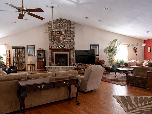 Detached two-car garageSeveral additional outbuildingsStriking masonry stone fireplace