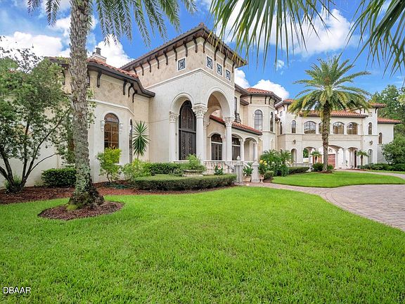 Luxury living in Pablo Creek Reserve! This stunning, Mediterranean-style estate home offers four ensuite bedrooms, two additional bedrooms or offices, eight bathrooms, and over 9,000 square feet of living area! Built to the highest standard with impeccable amenities and meticulous architectural design by Kevin Gray, this home seamlessly integrates an old-world feel with all the modern features today's luxury homebuyers have come to expect. The driveway to the house is the first of many wonders, paved with red and lime sandstone and leading to an oasis of palms. You will immediately notice the soaring windows and stately entry staircase leading to massive glass and scrollwork double doors. The vast, Spanish-style roof is supported by multiple monolithic pillars, two of which frame the first of two major entryways to the house. Enter through the massive foyer that extends to the back of the house and gives a glimpse of the pool and lake view within the back screened patio to find an elegant seating area featuring a gorgeous chandelier and the first of four wood-burning fireplaces found throughout the house. Located on the home's west wing, the massive chef's kitchen features exquisite custom cabinetry, a double oven with a gas range, an integrated paneled refrigerator, and a gorgeous center island with a sink. Adjacent to the kitchen is a bar and wine cellar that can store over 250 bottles, a fully furnished laundry room, a garage, and a butler's pantry. The first-floor master bedroom is a seven-piece ensuite with a standing tub and shower, two closets, a seating area, and two more walk-in closets. Ascend the winding staircase within the family room, and the second floor's features immediately become evident. The remaining three ensuite bedrooms are located here, each with a private walk-in closet. A recreation room with a pool table and a functioning bar connects the bathrooms and bedrooms. Follow the massive hallway on the west side of the home featuring arched windows showcasing the view of all surrounding flora and fauna to find the entry to your personal theatre! At roughly 770 square feet and furnished with plush leather recliners offering stadium seating for unimpeded views and maximum comfort, this theatre room also offers a bar and adjacent bathroom, a private entryway, and a balcony, making this the perfect space for entertaining! From the main drive, the second entrance to the home can be found through an immense stone archway framed by four more expansive pillars that truly capture the classical feel of the home's design. Following the continued paver driveway and passing through a breezeway, five garage door bays lead to the oversized four-car garage with additional space for golf carts. The outdoor space is unparalleled, situated on 1.57 acres and featuring a massive screened lanai, a saltwater pool, Gazebo, and a summer kitchen. This is truly luxury Florida living at its finest! Schedule your private showing today!