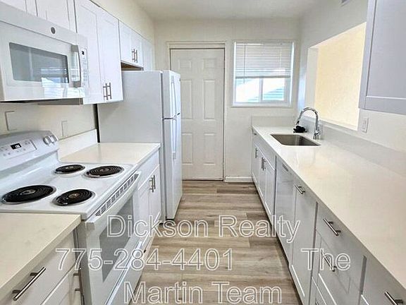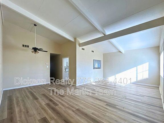 AVAILABLE NOW! This 3-bedroom, 1-bathroom home in Stead features vaulted ceilings, abundant natural light, neutral paint throughout, and vinyl flooring. The kitchen offers ample cabinet storage, a refrigerator for tenant use, and a cozy dining nook, while the spacious living room provides a comfortable setting. The bedrooms are nicely sized and share a full bathroom with a shower-tub combination. Outside, enjoy the spacious courtyard area and a large backyard, ideal for relaxing or entertaining. The home also includes a detached garage, washer/dryer hookups, and a refrigerator for tenant use. One pet considered with owner approval. Don't miss this opportunityschedule a showing today and make this home yours!
