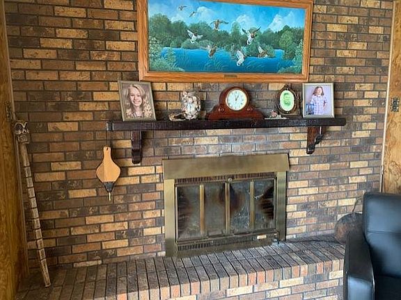 Living Room: Brick fireplace, carpet and paneled walls. Kitchen: Black cabinets, white trim, tile flooring. Large kitchen with lots of cabinets. Dining Area is also a nice size area, lots of windows. Bath: Tub and shower combo, large vanity, storage, tile flooring, all white decor. Bedroom: Large closet, carpet. Bedroom: King size bed would fit here, large closet, carpet. Basement: Can be future bedrooms, gas forced air furnace, central air. Garage: Made of concrete blocks 28' x 42'